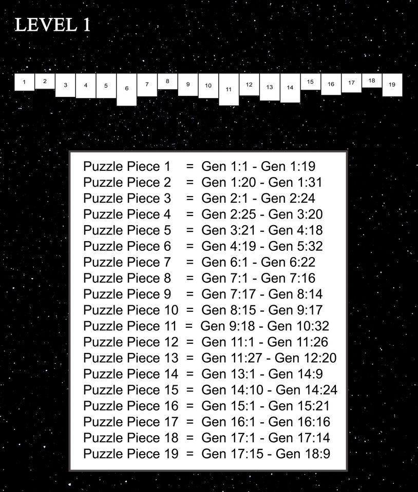 The image above lists the verses that create each puzzle piece for Level Two. The puzzle pieces align themselves from the left to the right.